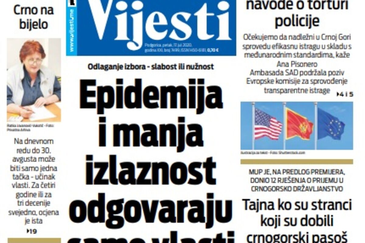 Naslovna Naslovne strane Naslovna strana "Vijesti" za petak 17. jul 2020. godine 3073 pregleda 0 komentar(a) Naslovna strana "Vijesti" za petak 17. jul 2020. godine, Foto: Vijesti Vijesti online 17.07.2020. 07:00h Naslovna strana "Vijesti" za petak 17. jul 2020. godine. Bonus video: Vijesti Naslovna strananaslovnicaVijestiND Vijesti