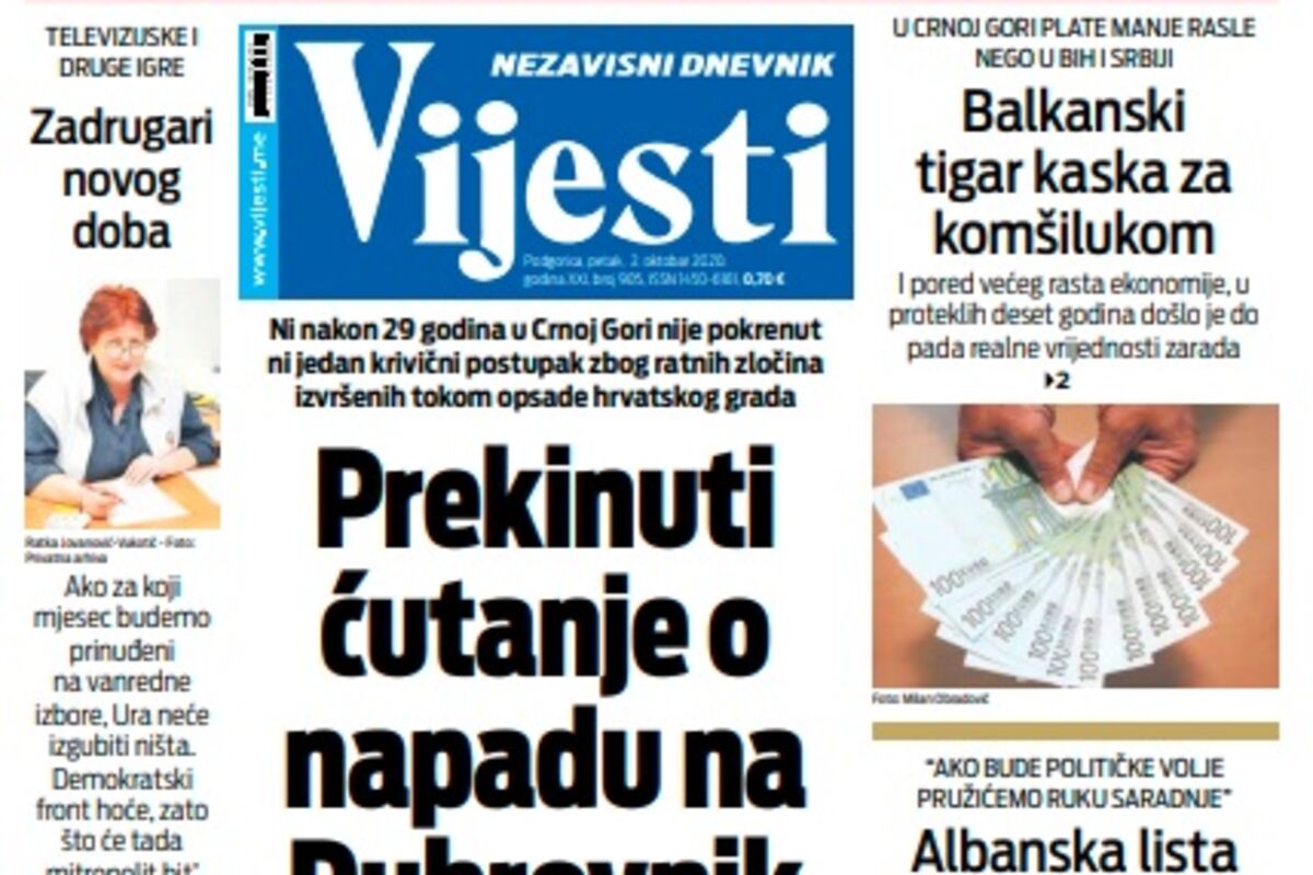 Naslovna Naslovne strane Naslovna strana "Vijesti" za petak 2. oktobar 2020. godine 4519 pregleda 1 komentar(a) Naslovna strana "Vijesti" za petak 2. oktobar 2020. godine, Foto: Vijesti Vijesti online 02.10.2020. 07:00h Naslovna strana "Vijesti" za petak 2. oktobar 2020. godine. Bonus video: Vijesti Naslovna strananaslovnicaVijestiND Vijesti