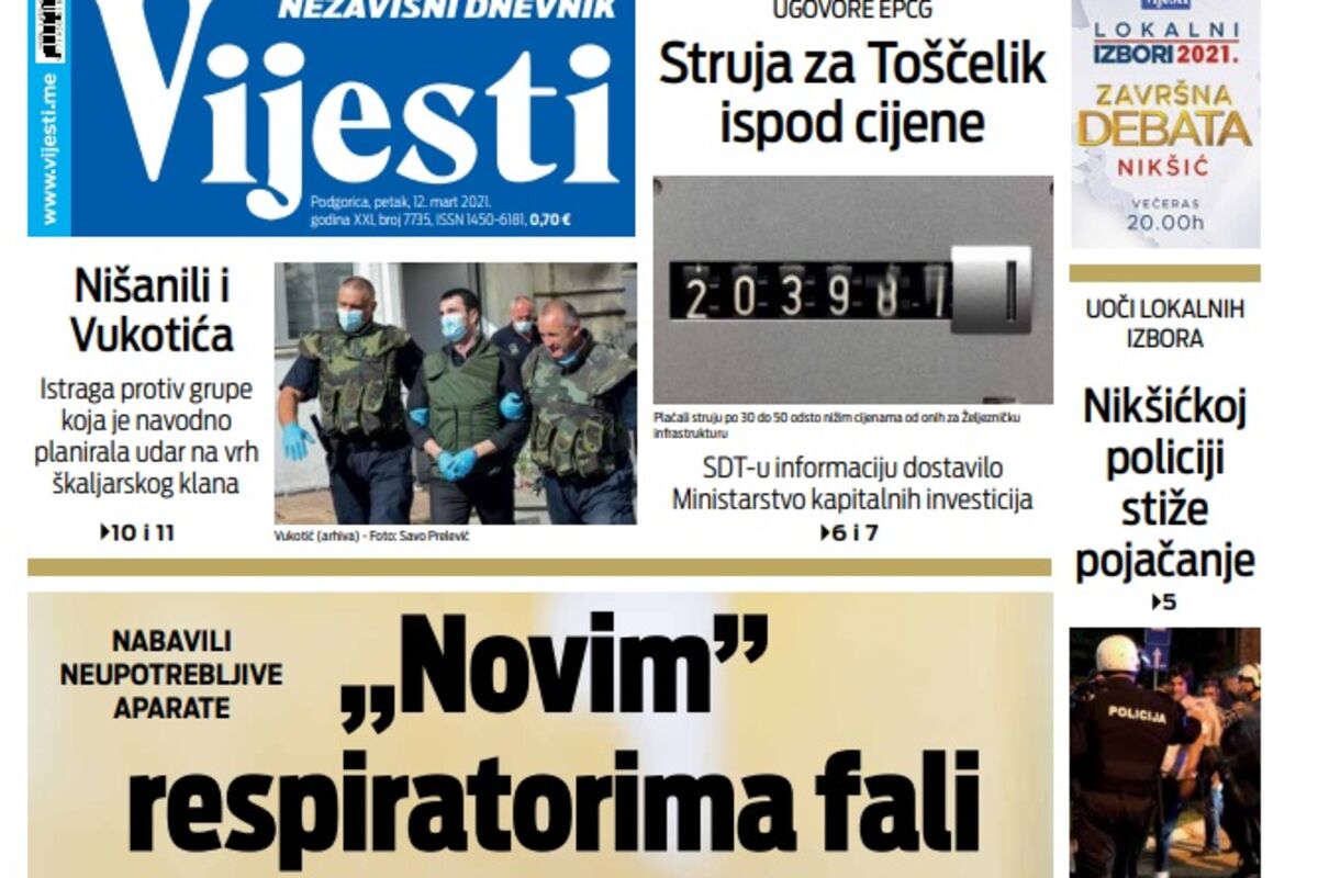 Naslovna Naslovne strane Naslovna strana "Vijesti" za petak 12. mart 2021. godine 4633 pregleda 0 komentar(a) Naslovna strana "Vijesti" za petak 12. mart 2021. godine, Foto: Vijesti Vijesti online 12.03.2021. 07:00h Naslovna strana "Vijesti" za petak 12. mart 2021. godine. Bonus video: Vijesti Naslovna strananaslovna stranaND VijestiVijestiNezavisni dnevnik VijestiDaily pressnaslovnicaNaslovnica