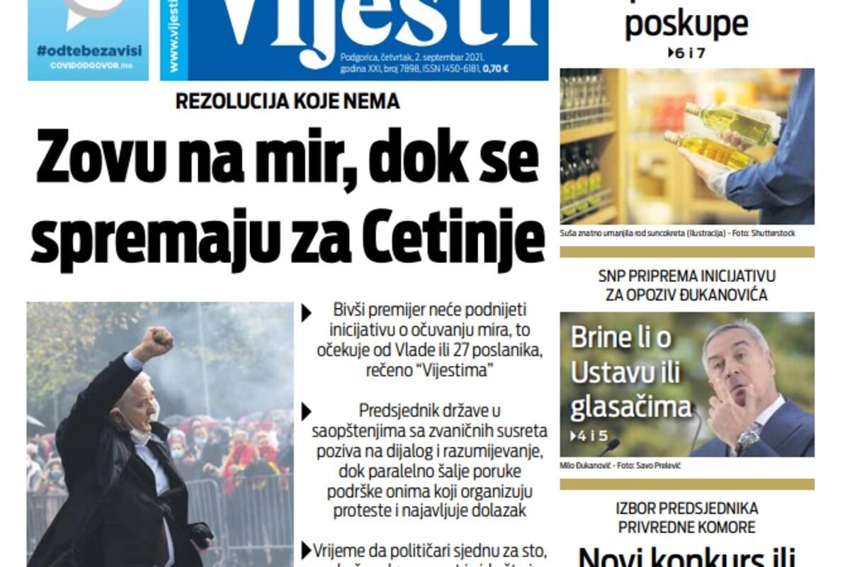 Naslovna Naslovne strane Naslovna strana "Vijesti" za 2. septembar 2021. 3412 pregleda 0 komentar(a) Naslovna strana "Vijesti" za 2. septembar 2021., Foto: Vijesti Vijesti online 02.09.2021. 06:00h Bonus video: Vijesti naslovna stranaVijestiND Vijesti