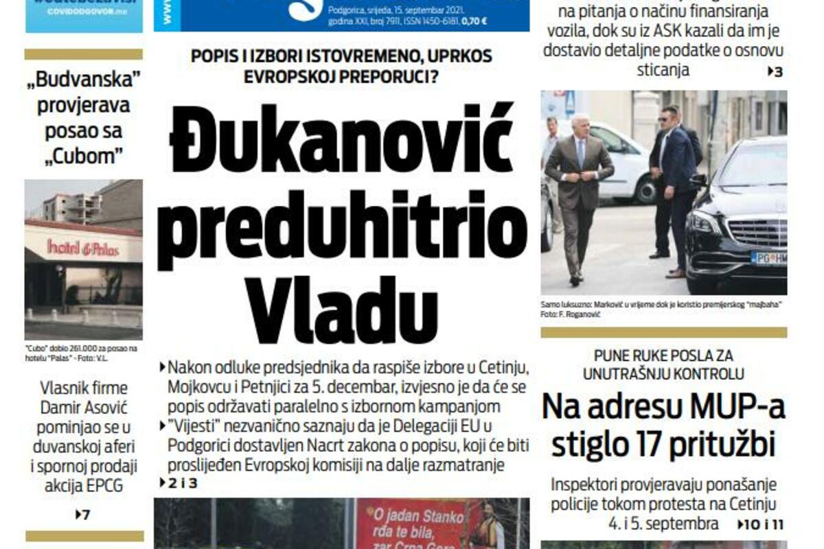 Naslovna strana "Vijesti" za srijedu 15. septembar 2021. godine