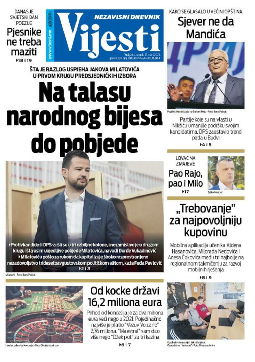 Naslovna Naslovne strane Naslovna strana "Vijesti" za 21. mart 2023. godine 4420 pregleda 1 komentar(a) Foto: Vijesti Vijesti online 21.03.2023. 06:00h foto: Vijesti Bonus video: Vijesti VijestiND Vijestinaslovna strananaslovnica
