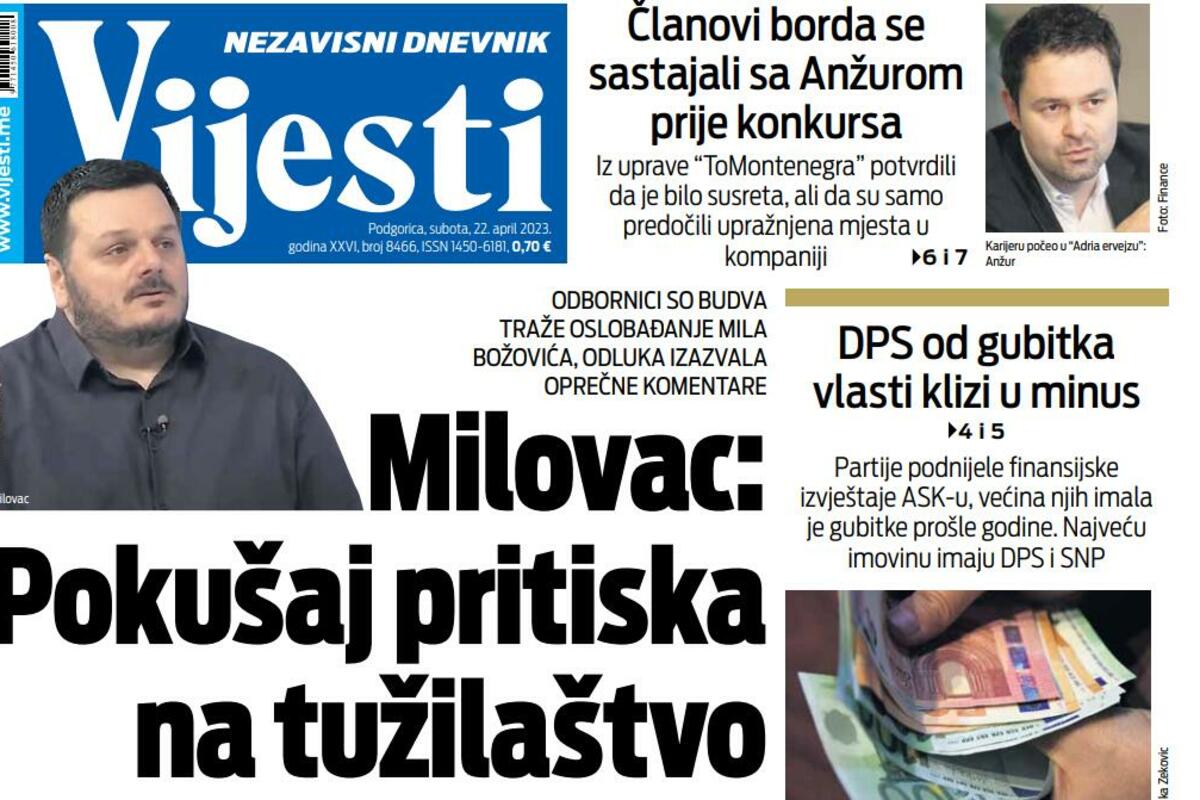 Naslovna Naslovne strane Naslovna strana "Vijesti" za 22. april 2023. godine 4801 pregleda 0 komentar(a) Naslovna strana, Foto: Printscreen Vijesti online 22.04.2023. 07:00h Naslovna stranafoto: Vijesti Bonus video: Vijesti VijestiND VijestiNaslovna strana