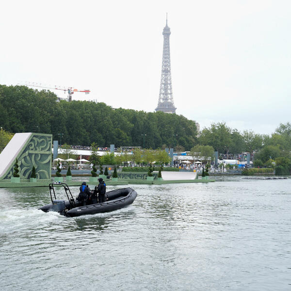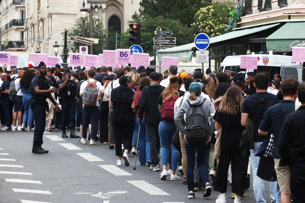 Gledaoci sa ulaznicama sporo prolaze policijske kontrole pred 15 tribina za stojanje na obalama rijeke Sene sa 220.000 besplatnih mjesta.
