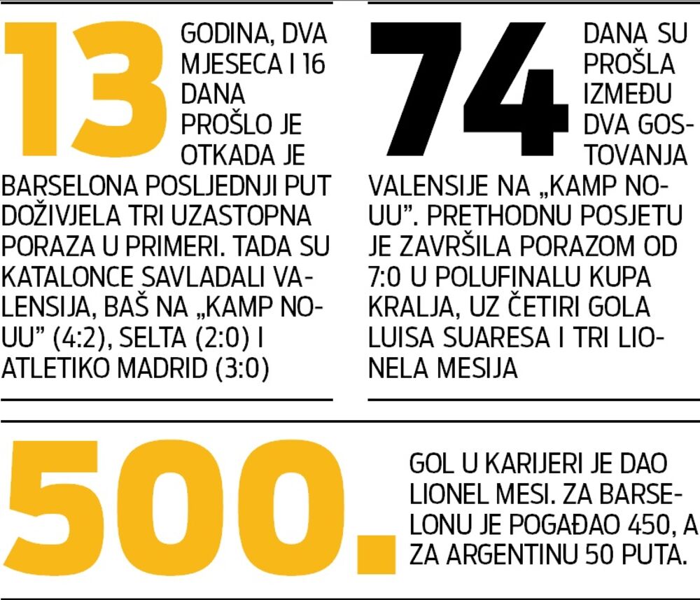 Katalonci su nakon više od 13 godina vezali tri poraza u Primeri, a ovaj im je nanijela Valensija, koja je osvojila "Kamp nou" (2:1).