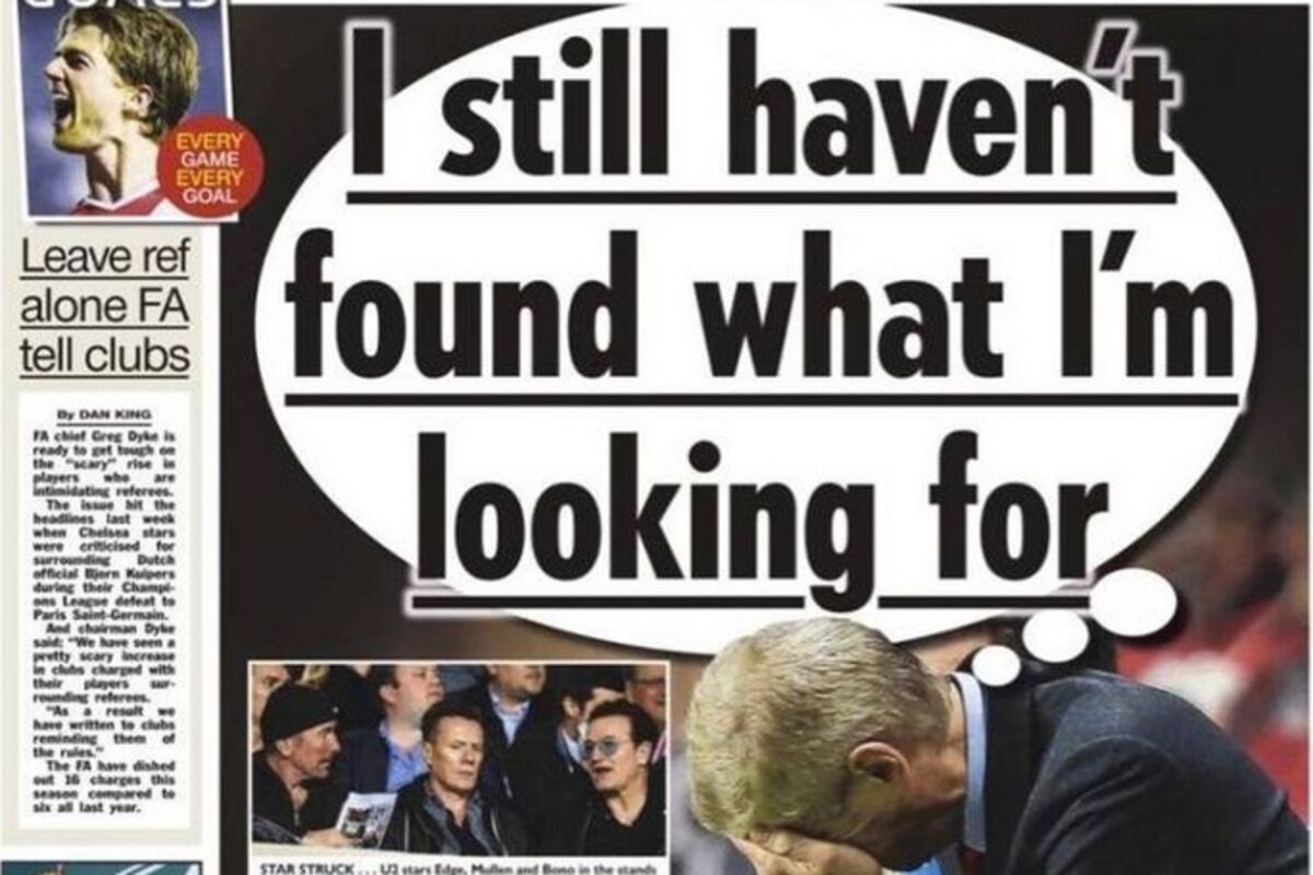 Uz sliku Arsena Vengera kako se drži za glavu, citirani su stihovi pjeseme U2: "I still haven`t found what I`m looking for".