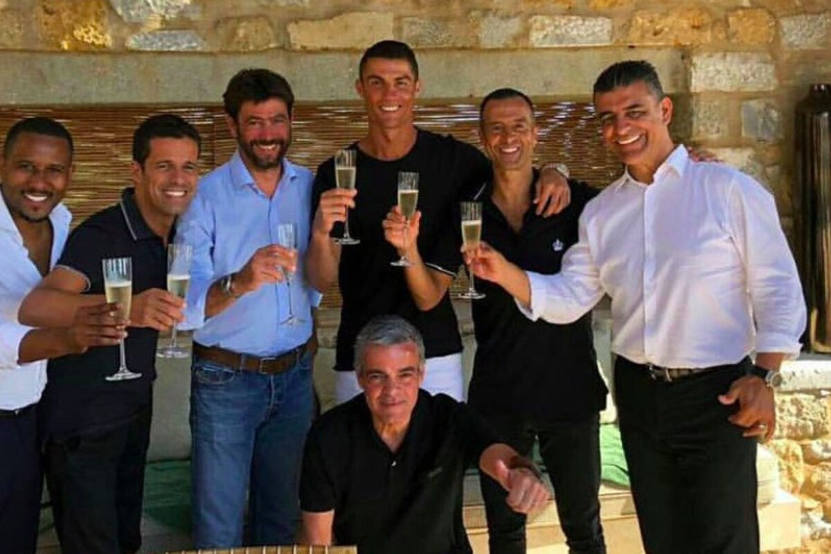 Na slici Ronaldo sa predsjednikom Juventusa Andreom Anjelijem, agentom Žoržom Mendešom i prijateljima ispija šampanjac, u čast novog transfera.