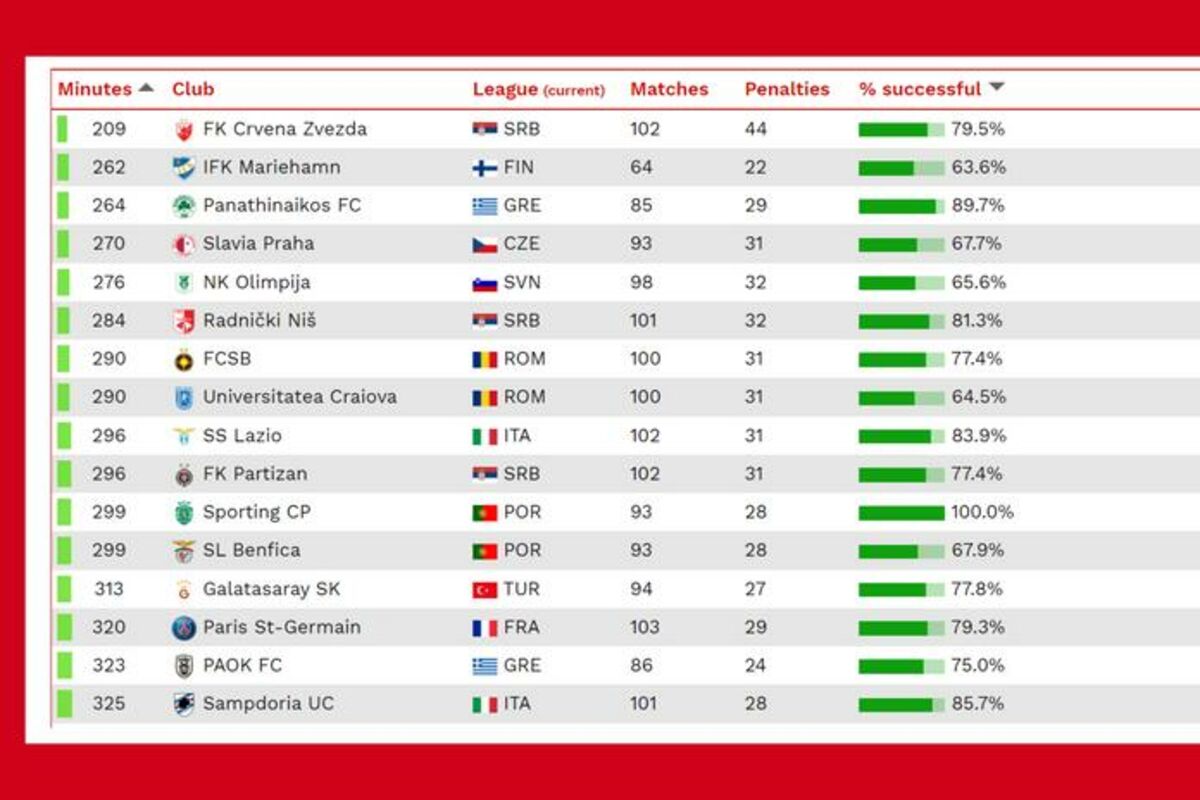 U vrhu je i finski Marijehamn (22 penala na 64 meča), te Panatinaikos (29/85), Slavija iz Praga (31/93), Olimpija (32/98)...