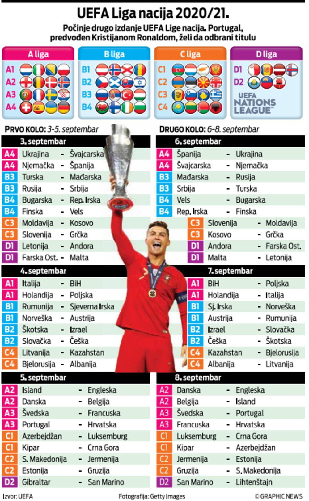 Derbijem Njemačke i Španije na „Mercedes benc areni” u Štutgartu večeras startuje Liga nacija. Okršajem dvije fudbalske velesile počeće i borba za pobjednika četvrte grupe A Lige nacija, dok će se istovremeno u Ljvovu nadmetati ostale dvije selekcije iz iste grupe - Ukrajina i Švajcarska.