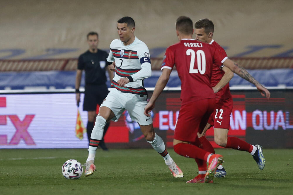 Ronaldo je sinoć u finišu utakmice iskoristio grešku golmana Srbije Marka Dmitrovića, loptu poslao u praznu mrežu, ali je Stefan Mitrović intervenisao, a sudija Dani Makelije nije priznao pogodak, iako je lopta prešla gol liniju.