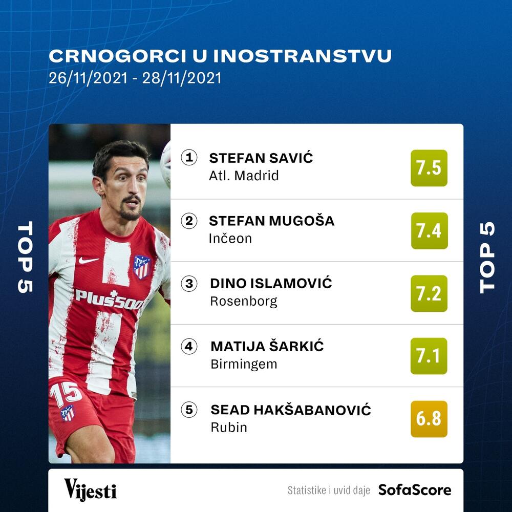 Fudbaler madridskog Atletika Stefan Savić je najbolje ocijenjeni crnogorski internacionalac prethodnog vikenda. Savić je komandovao odbranom Atletika u pobjedi (4:1) na gostovanju Kadisu, pa ga je Sofascore ocijenio sa 7,5.
