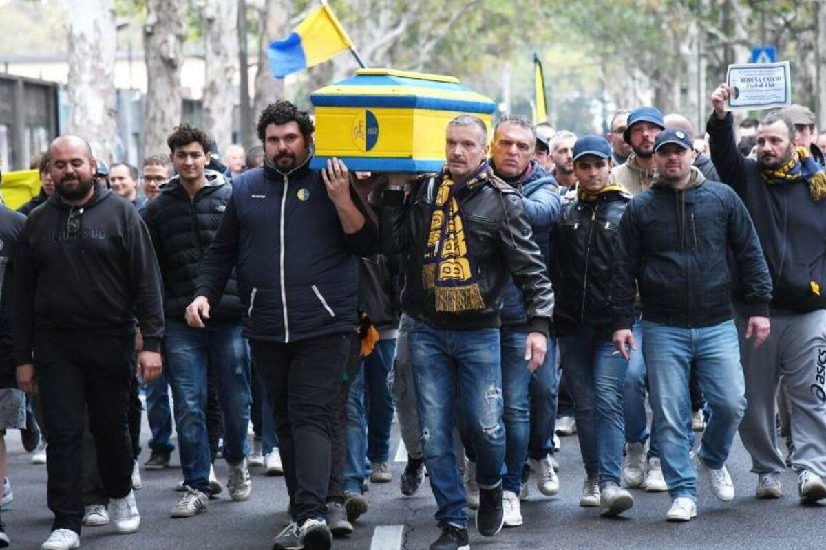 Navijači italijanske Modene prošetali su jutros ulicama grada, simbolično noseći kovčeg u bojama klupske zastave.