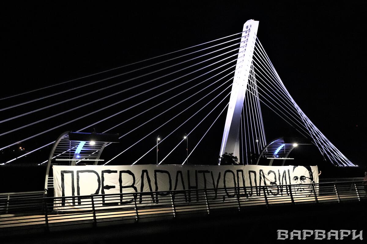 "Prevarantu, odlazi", pisalo je pored Mijačevog lika na transparentu koji se sinoć pojavio na Moskovskom mostu u Podgorici.