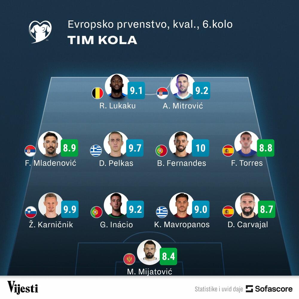 Čuvar mreže reprezentacije Crne Gore dobio je prosječnu ocjenu 8,4, a zajedno sa njim i timu kola našli su se Žan Karničnik (Slovenija), Gonsalvo Inacio, Bruno Fernandeš (Portugal), Konstantinos Mavropanos, Dimitris Pelkas (Grčka), Dani Karvahal, Feran Tores (Španija), Filip Mladenović, Aleksandar Mitrović (Srbija) i Romelu Lukaku (Belgija).
