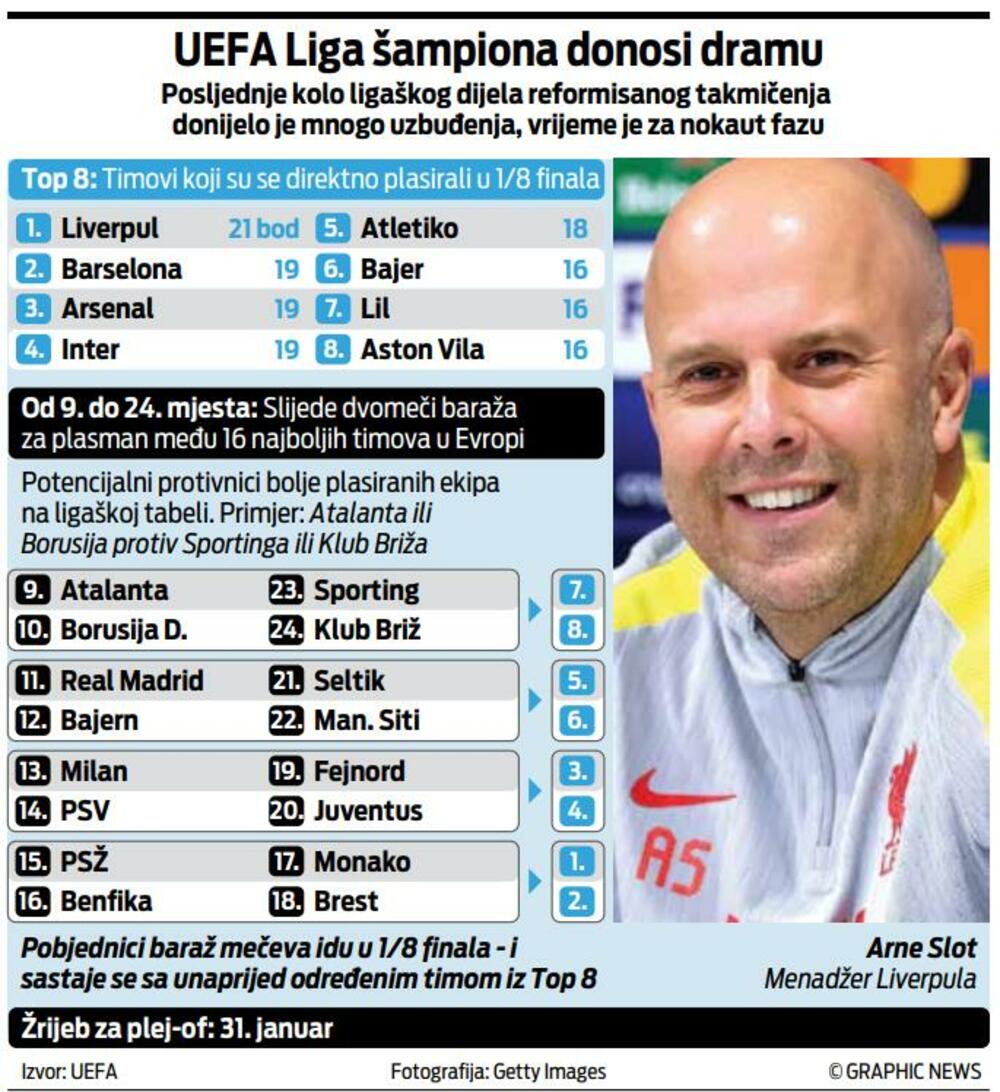 Osam najboljih ekipa ligaškog dijela - Liverpul (1), Barselona (2), Arsenal (3), Inter (4), Atletiko Madrid (5), Bajer Leverkuzen (6), Lil (7) i Aston Vila (8) - zasluženo odmaraju do osmine finala, a tek nakon što se završe baraž mečevi na novom žrijebu će saznati imena rivala.