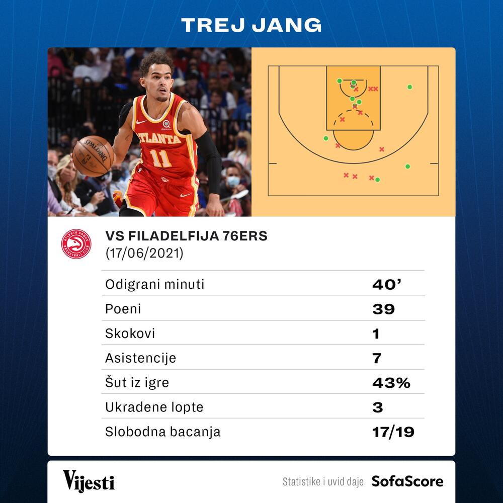 Hoksi su nadoknadili zaostatak od 26 poena iz prva tri minuta treće četvrtine. Filadlefija je u završnici treće dionice vodila sa 87:69, ali nije uspjela da sačuva prednost i drugi put u seriji je izgubila na domaćem terenu. Jang je u završnici fauliran za tri poena, pogodio je sva tri slobodna bacanja i poveo ekipu do važne pobede. U ekipi iz Filadlefije najefikasniji su bili Džoel Embid sa 37 poena, 13 skokova, pet asistencija, četiri blokade i dve ukradene lopte i Set Kari sa 36 poena i sedam skokova. Samo njih dvojica su postigli koševe iz igre u drugom poluvremenu u ekipi Filadelfije. Ben Simons dodao je osam poena i devet asistencija. Šesta utakmica igra se u noći između petka i subote, a Atlanta će pokušati da ostvari pobjedu koja bi joj donijela plasman u finale konferencije prvi put od 2015. godine. Košarkaši Los Anđeles Klipersa poveli su sa 3:2 protiv Jute u polufinalu Zapadne konferencije pošto su pobijedili sa 119:111.