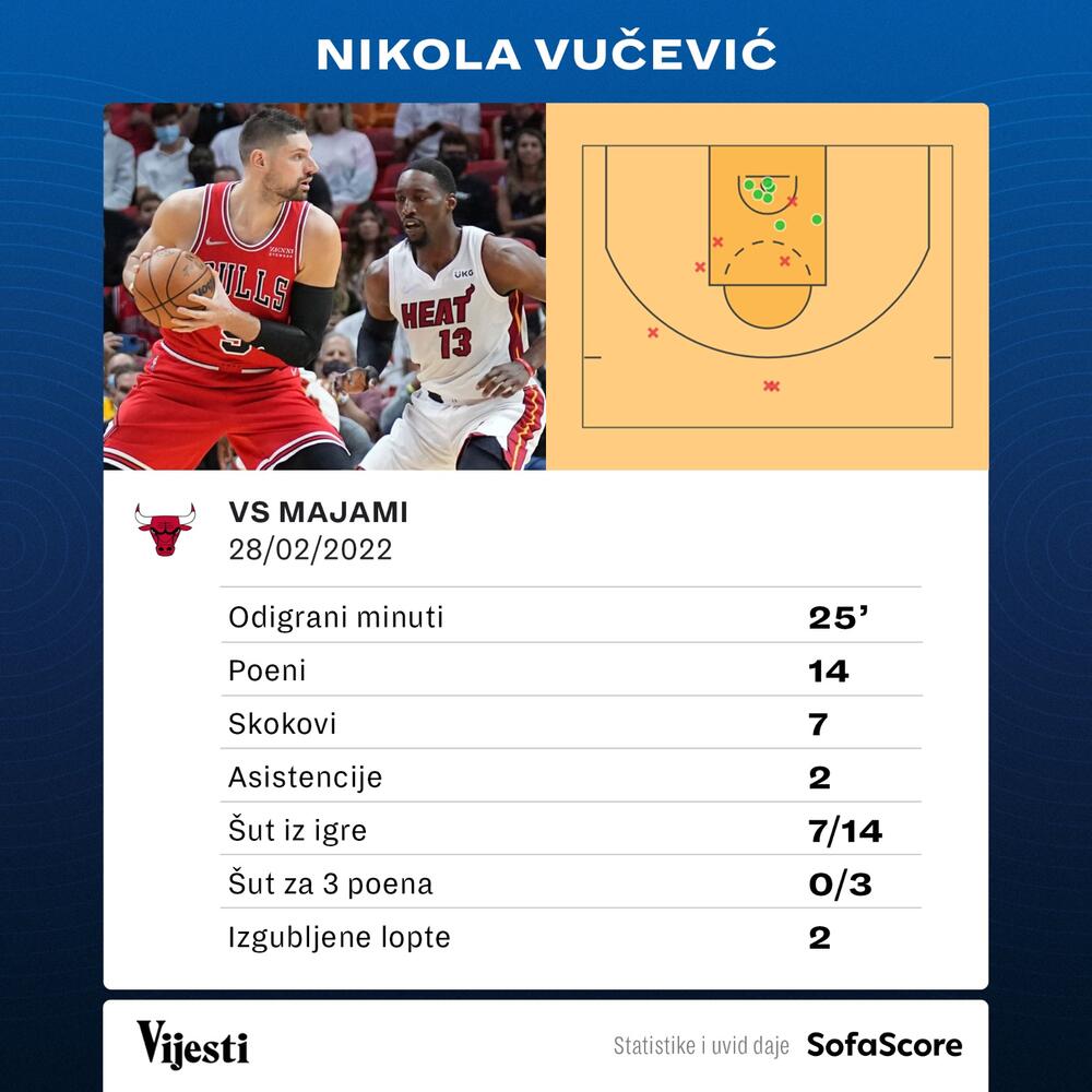 Nikola Vučević je igrao samo 25 minuta, upisao 14 poena i sedam skokova.