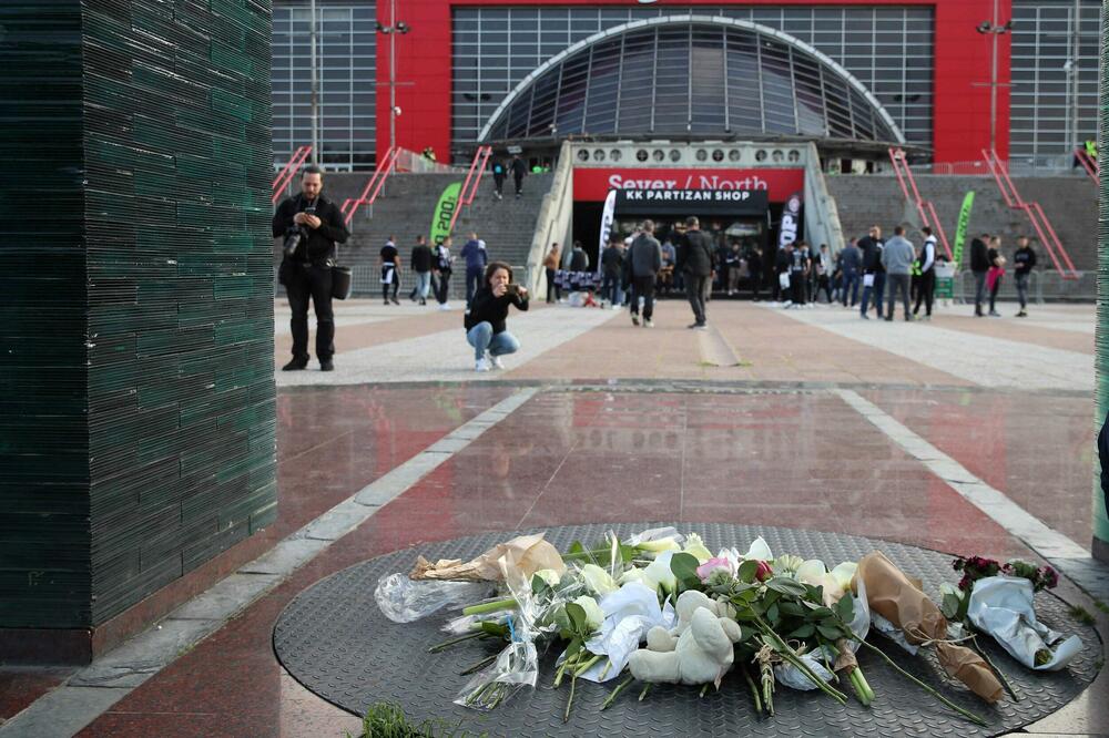 Navijači Partizana ostavljaju cvijeće i pale svijeće ispred Beogradske arene, odajući poštu ubijenima u Osnovnoj školi "Vladislav Ribnikar" u Beogradu.