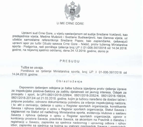 "Najnovijim rješenjem od 24.decembra 2019 godine, sud je poništio rješenje Ministarstva sporta i mladih kojim je, preko Uprave za inspekcijske poslove, Džudo savezu Crne Gore privremeno zabranjeno obavljanje sportskih aktivnosti i djelatnosti", navodi se u saopštenju DŽSCG.