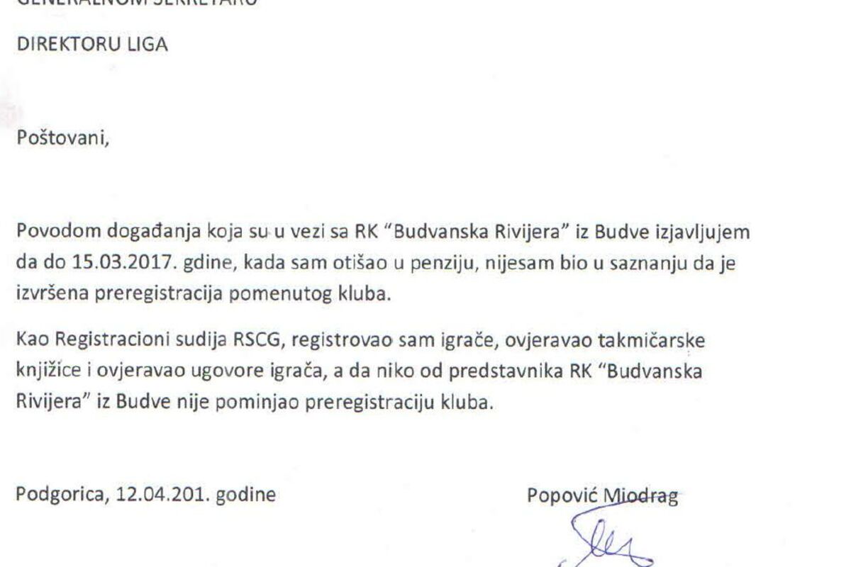 Kao registracioni sudija RSCG, registrovao sam igrače, ovjeravao sam takmičarske knjižice i ovjeravao ugovore igrača, a da niko od predstavnika RK 'Budvanska rivijera' iz Budve nije pominjao preregistraciju kluba”, stoji u izjavi Miodraga Popovića, koju je potpisao 12. aprila.