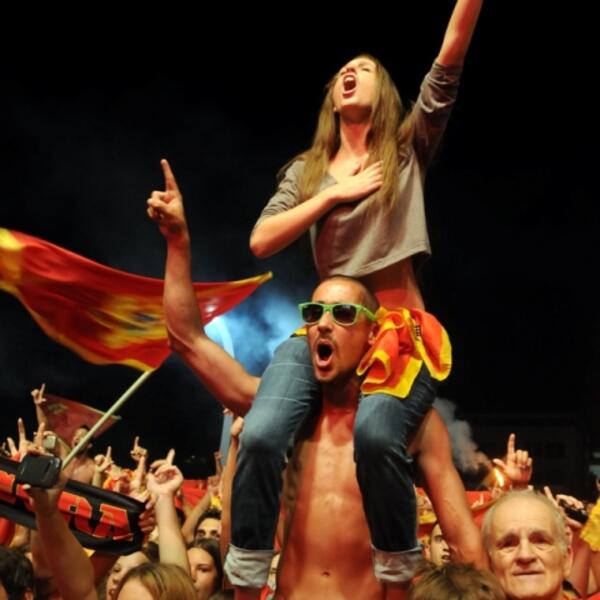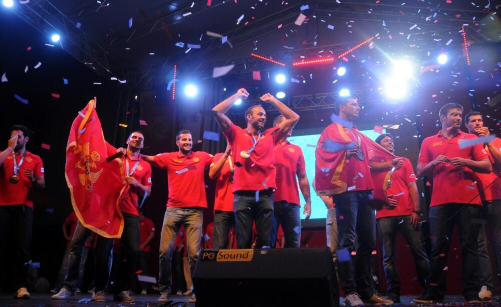 Vaterpolisti su na Trg Republlike stigli desetak minuta nakon 21 čas, a nekoliko hiljada ljudi ih je dočekalo himnom reprezentacije "najbolje su crnogorske ajkule", te tradicionalnom navijačkom pjesmom "Crna Goro volim te", kao i parolom "vi ste naše zlatne ajkule"...
