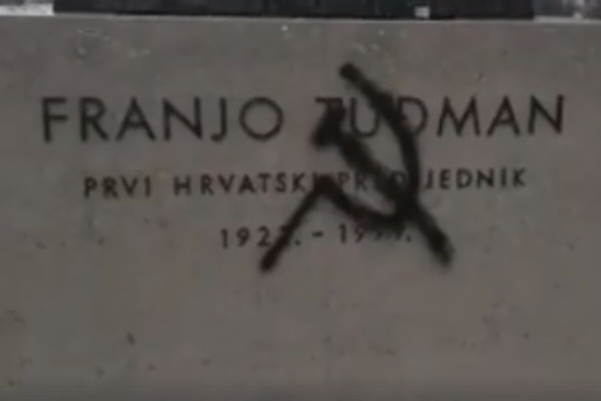 Nepoznati počinioci su preko natpisa 'Franjo Tuđman prvi hrvatski predsjednik' nacrtali su srp i čekić.