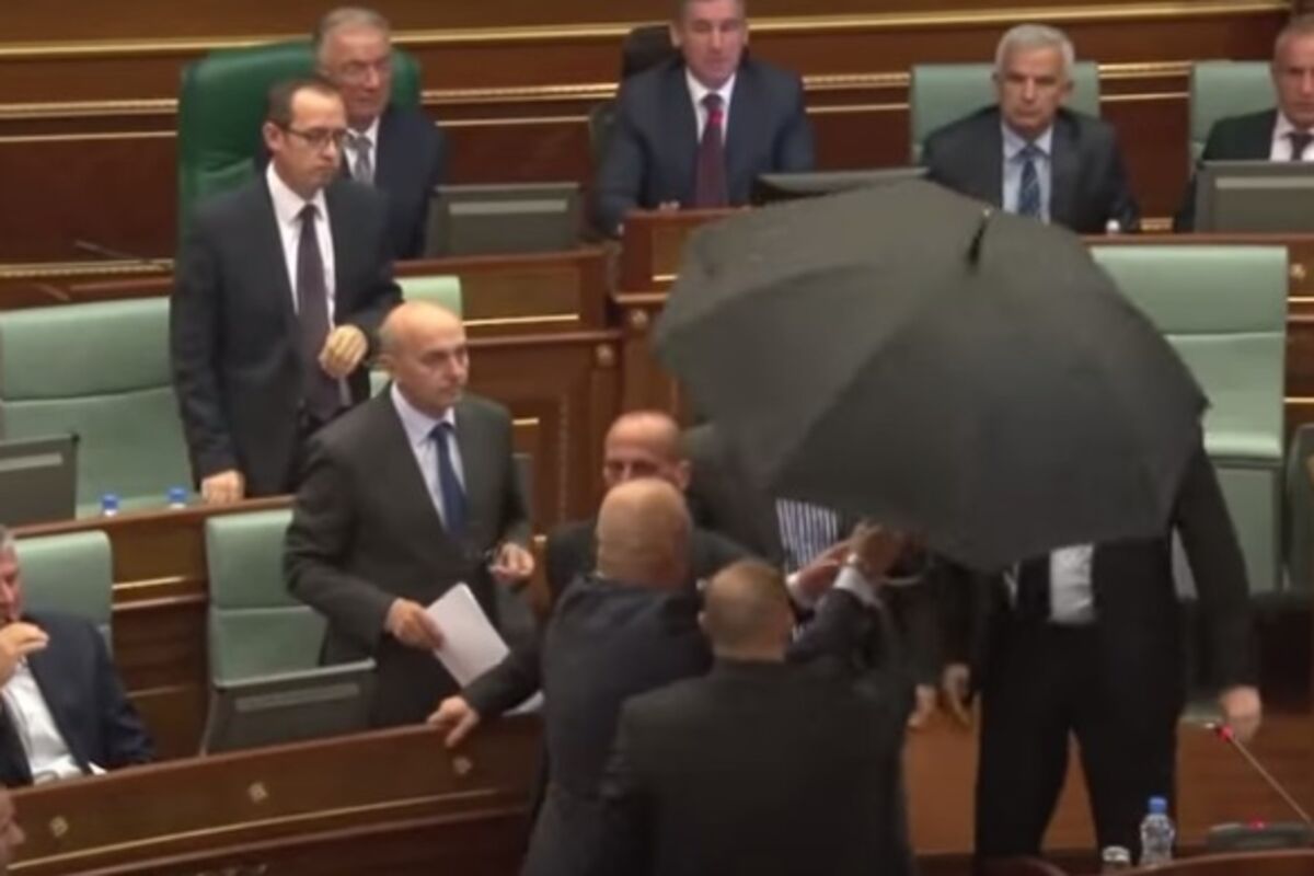 Obezbjeđenje je izvelo Mustafu iz sale za sjednice tako što su raširili kišobran da bi ga zaštitili.