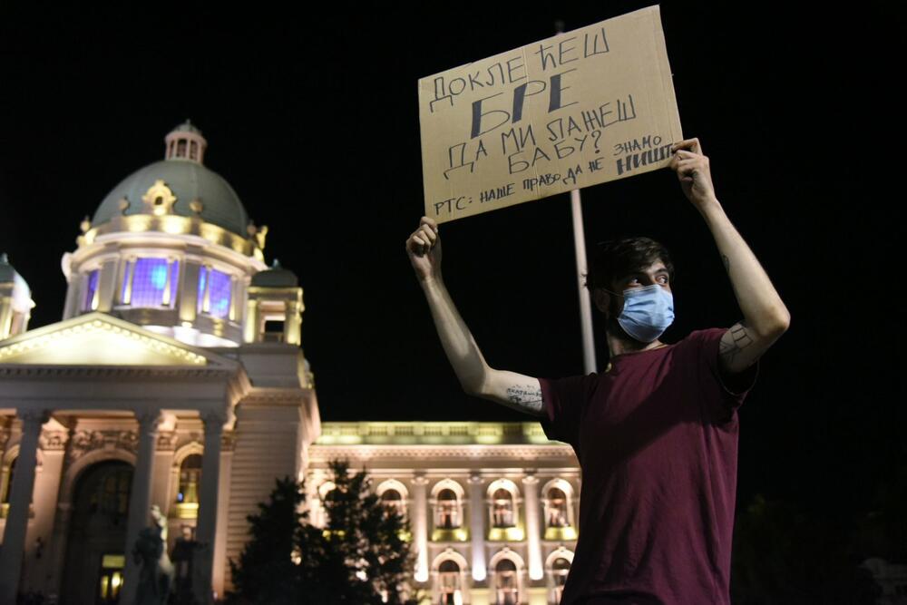 19:44 Građani su se na platou ispred Skupštine Srbije u Beogradu okupili oko novinarke Radio televizije Srbije (RTS) sa transparentom "Nije politika, nije kovid, nego zdrav razum" i poručili "Sjedi dolje, ua RTS".