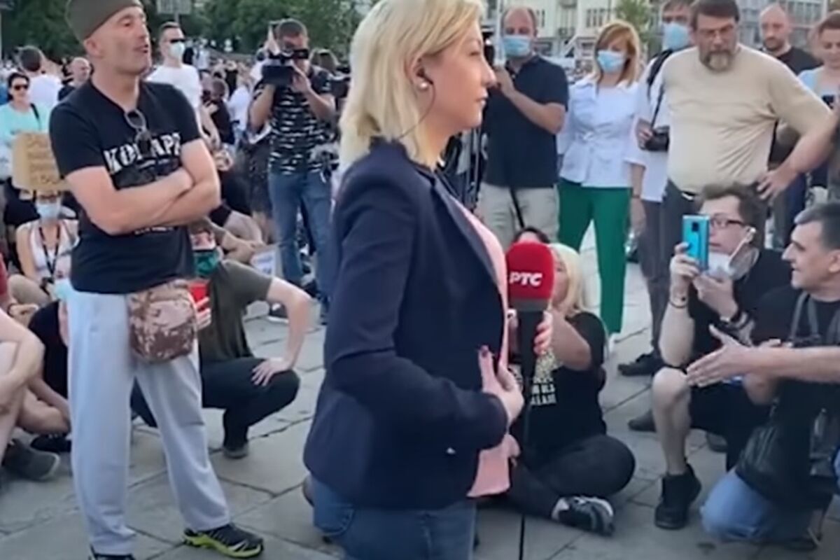 Kako piše Nova.rs okupljeni su posijedali na pod oko novinarke i dok se uključivala uživo u program iza njenih leđa razvili transparent "Nije politika, nije kovid, nego zdrav razum".