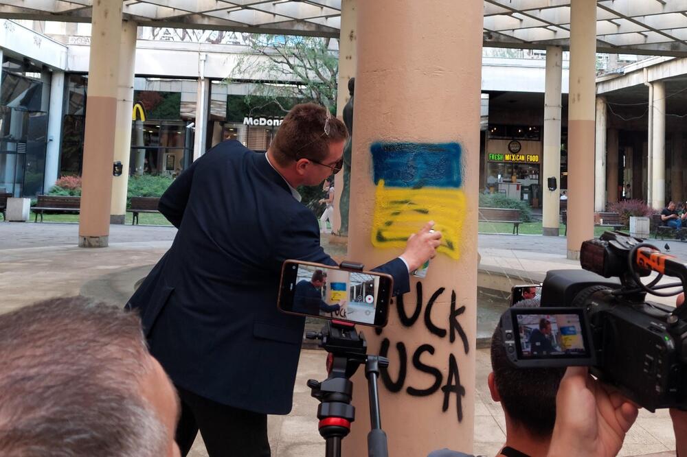 Advokat Čedomir Stojković rekao je novinarima da je Srbija pod "medijskom okupacijom režima (ruskog predsjednika) Vladimira Putina pod kojom se dogodila epidemija takvih grafita".