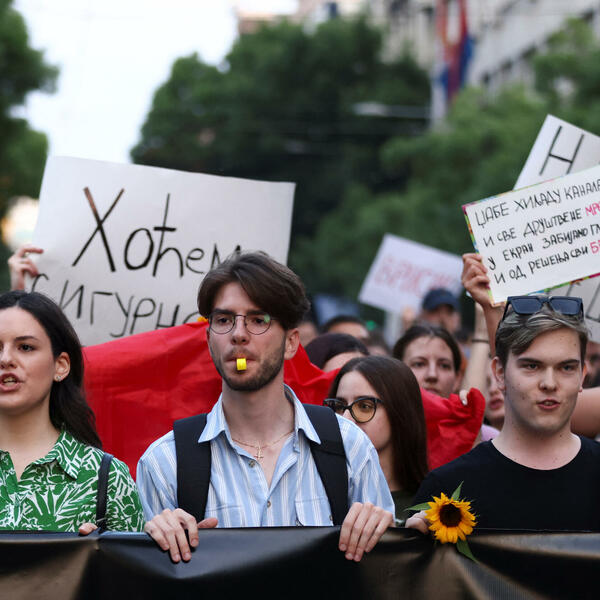 Učesnici protesta "Srbija protiv nasilja" večeras su poslije šetnje centralnim beogradskim ulicama formirali takozvani "prsten" oko zgrade predsjedništva, odnosno Generalnog sekretarijata predsjednika Srbije.