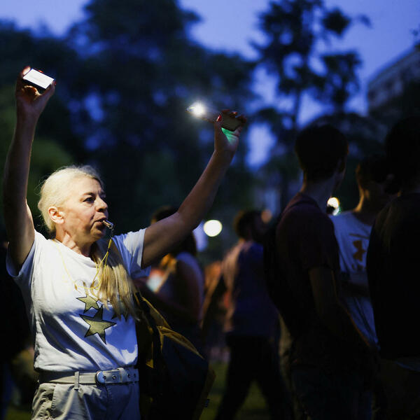 Učesnici protesta duvaju u trube i zvižde zražavajući time nezadovoljstvo aktuelnim vlastima predvođenim predsjednikom Srbije Aleksandrom Vučićem.