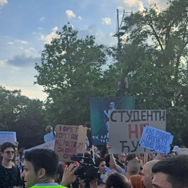 Prethodno je grupa studenata iza transparenta "Studenti protiv nasilja" podsjetila da su protesti mirni i nenasilni, i pozvala okupljene da se raziđu.