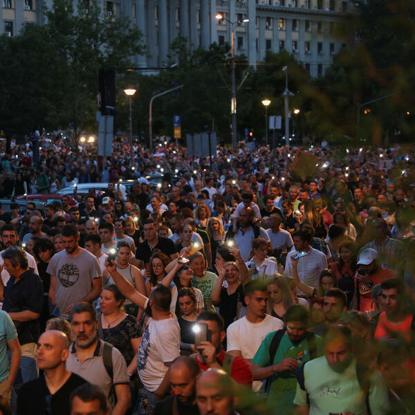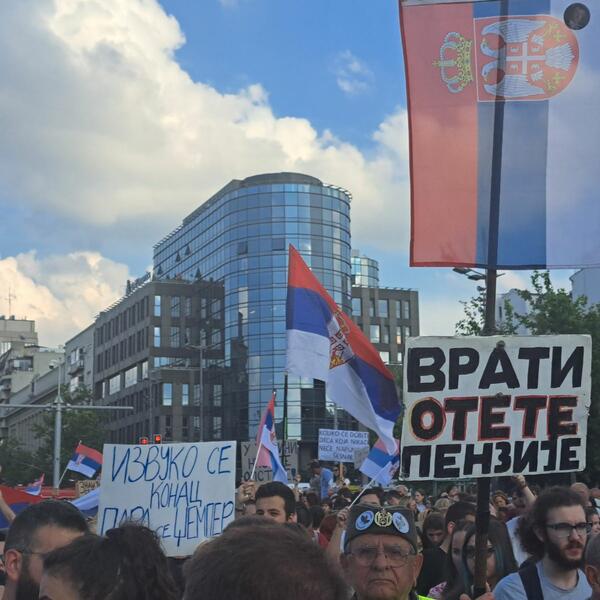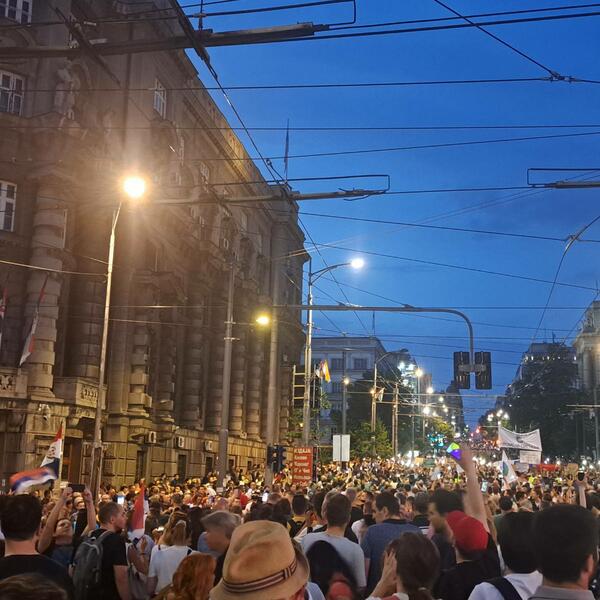Prethodno je neprekidna kolona učesnika protesta oko sat vremena iz pravca Nemanjine prolazila pored Vlade Srbije, oko koje je bio formiran svojevrstan prsten.