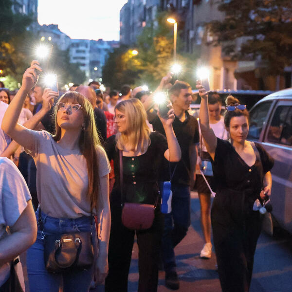 Protest je počeo oko 18 časova ispred Skupštine Srbije, a okupljeni su se uputili u šetnju nakon govora nekoliko glumaca, profesora i studenata.