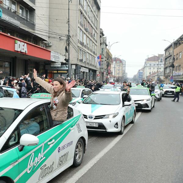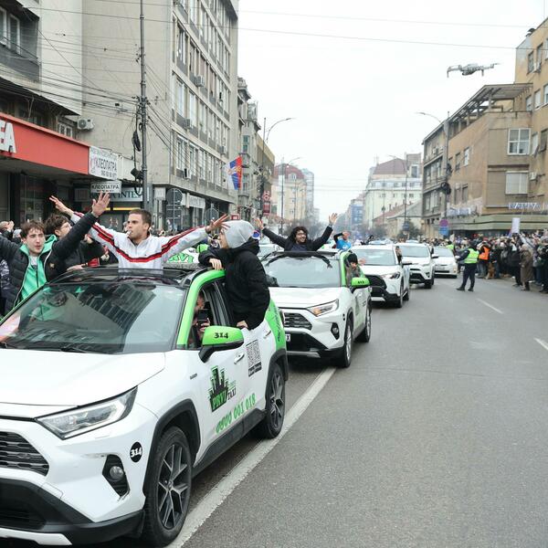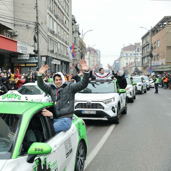 Građani su napravili špalir na centralnom gradskom trgu i aplauzima, ovacijama, zviždući pištaljkama i skandiranjem "Pumpaj, pumpaj" dočekali kolonu taksi vozila koja je vratila studente, profesore i maturante u Niš.