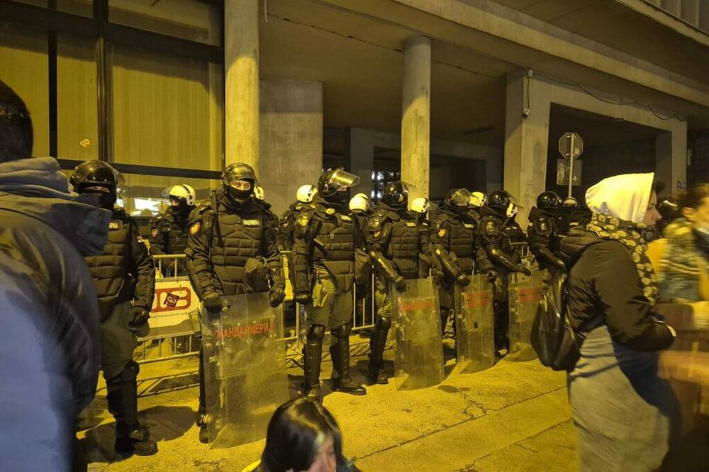 Iz tog medija navode da se oko 2.30 časova pojavila Žandarmerija iz pravca Stražilovske ulice i Bulevara Mihajla Pupina, koja se potom rasporedila pored ograde koja se nalazi ispred zgrade gradske skupštine na Ulici Žarka Zrenjanina.