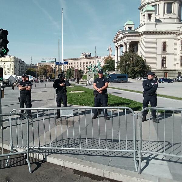 Građani stoje kraj metalne ograde koja dijeli "ćacilend", šatorsko naselje pristalica vlasti, i zgradu Skupštine od Bulevara kralja Aleksandra, jer Hrku policija nije pustila da dođe do stepenica Narodne skupštine, gdje je namjeravala da štrajkuje.