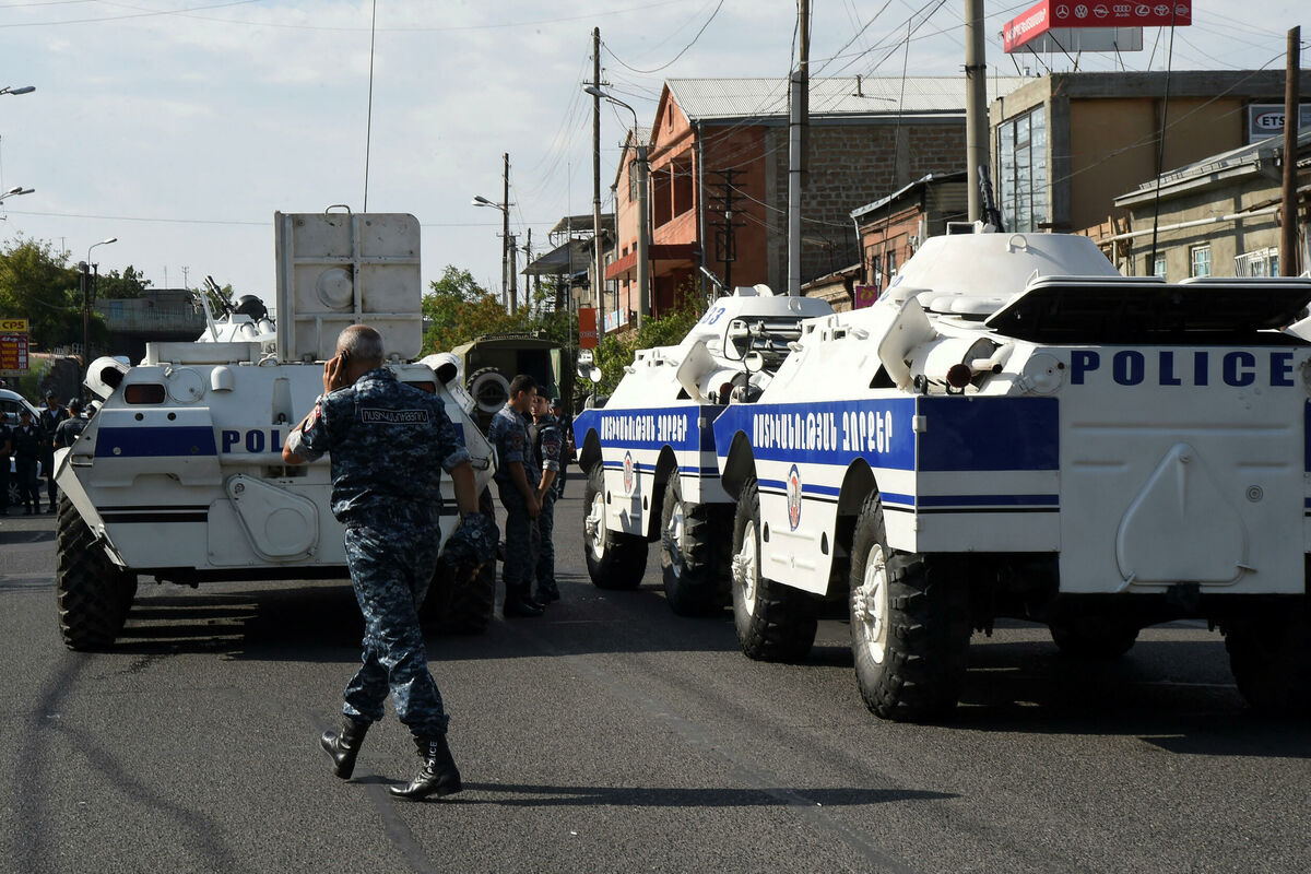 Policijski automobili, oklopna vozila i vojni kamioni u potpunosti su blokirali prilaze policijskoj bazi koju su zauzeli opozicionari, na ulazu u četvrt Erebuni u Jerevanu.