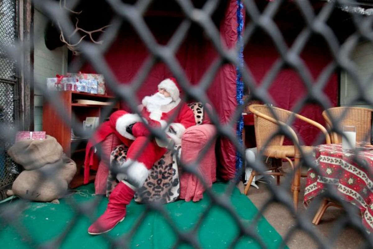 Obučeni u odjeću Deda Mraza trojica muškaraca provode dane pred Božić u kavezu u Zoo vrta u Pragu.
