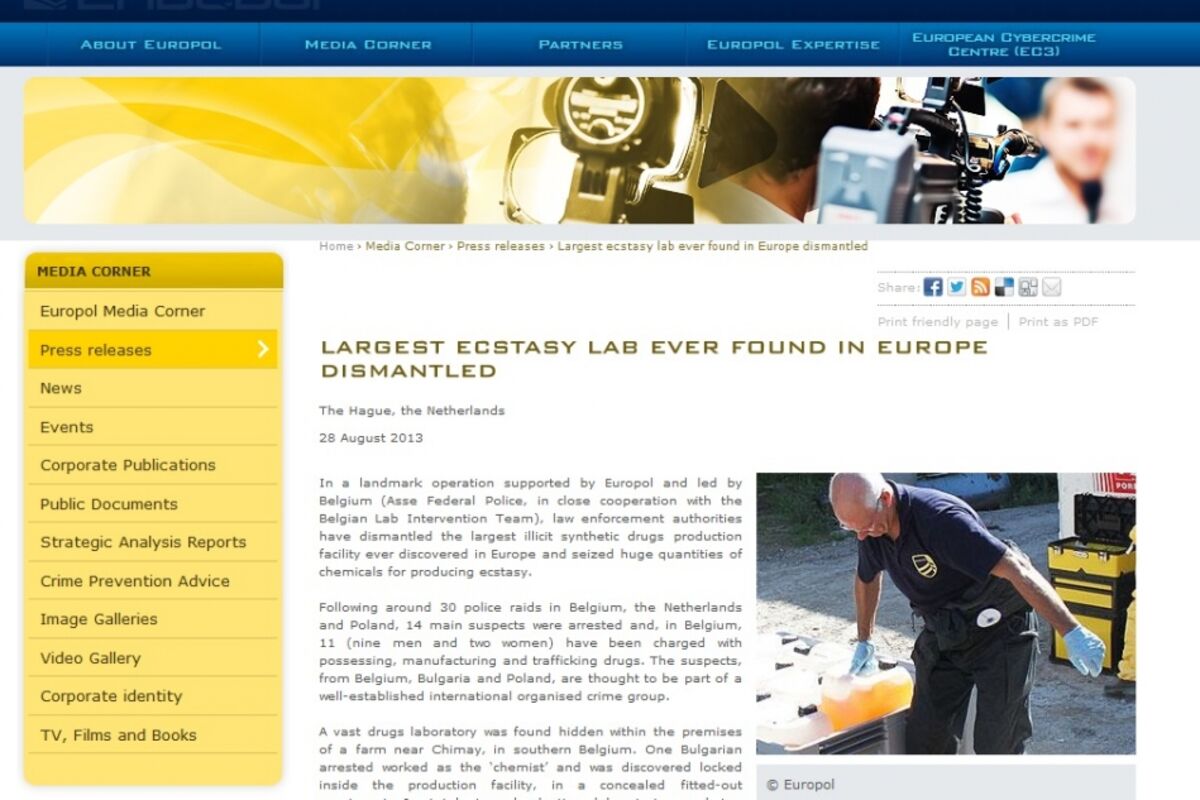 Belgijska policija u saradnji sa evropskom policijom - Evropolom uništila je najveću laboratoriju za proizvodnju sintetičkih droga ikad otkrivenu u Evropi i zaplijenila ogromne količine hemikalija za proizvodnju ekstazija, saopštio je danas Evropol.