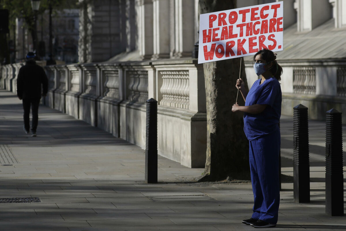 U bolničkoj odjeći i s maskom za lice, Viz je ispred kabineta premijera Borisa Džonsona istakla transparent s natpisom "Zaštitite zdravstvene radnike".