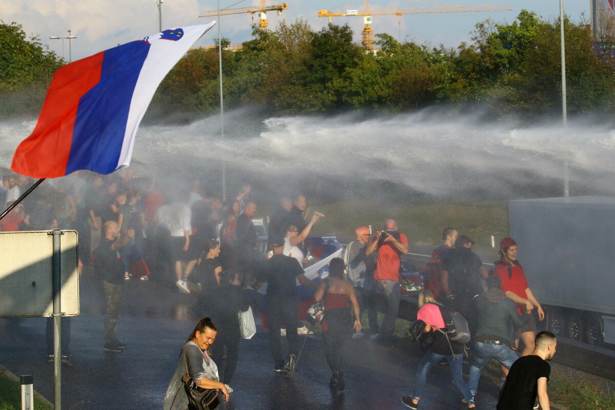 Policijski helikopter nadlijetao je centar Ljubljane dok je policija ispaljivala suzavac i koristila vodene topove dok su demonstranti pokušavali da promarširaju centrom grada.