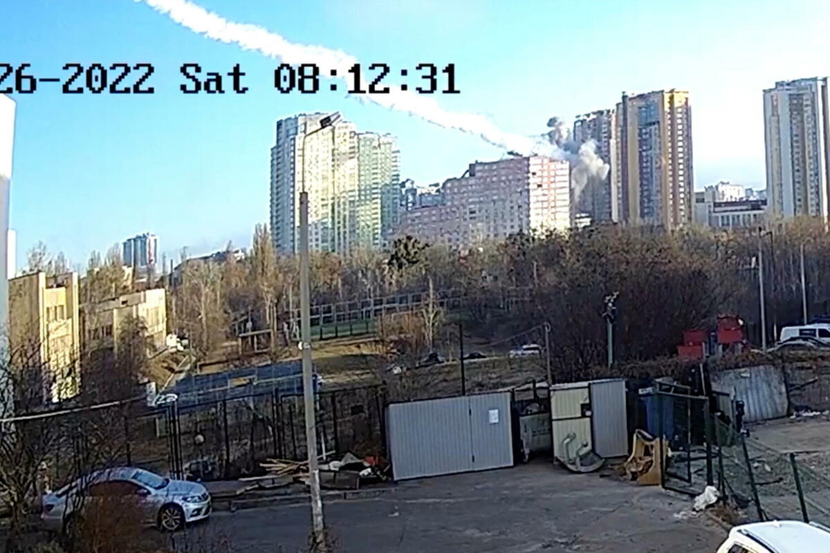 Snimak sa nadzorne kamere pokazuje trenutak kada je projektil jutros pogodio stambenu zgradu u Kijevu, glavnom gradu Ukrajine.