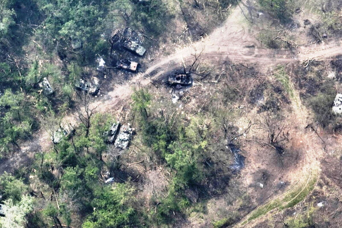 Na snimcima i fotografijama sa lica mjesta vide se desetine spaljenih i uništenih tenkova, a prethodno su ukrajinske snage granatirale ruski pontonski most.