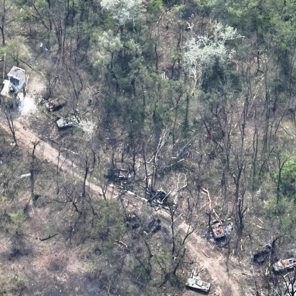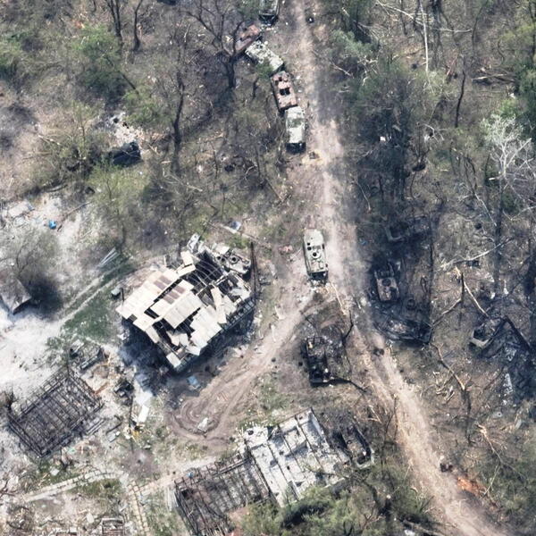 Ukrajinsko ministarstvo odbrane objavilo je, kako je kazalo, slike oštećenog ruskog pontonskog mosta preko rijeke Severski Donjec, s nekoliko uništenih ili teško oštećenih ruskih vojnih vozila u blizini, prenosi redakcija Radija Slobodna Evropa na engleskom jeziku.
