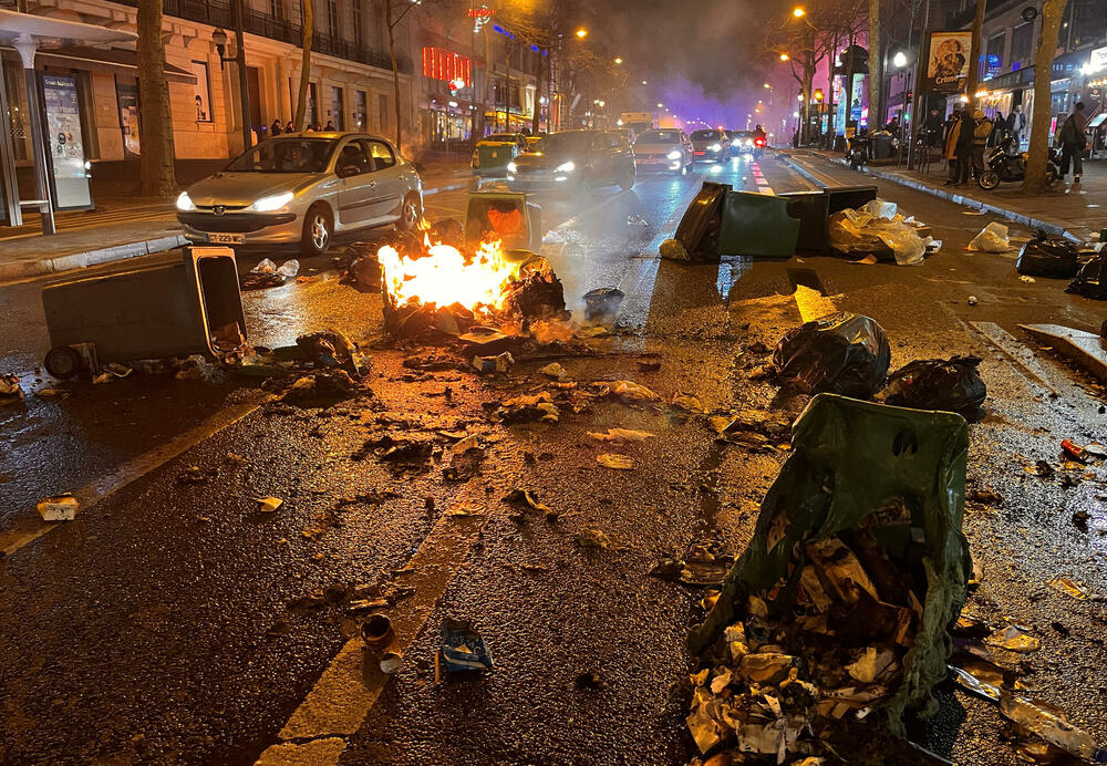 Protesti širom Francuske održani su u ponedjeljak uveče, nekoliko sati nakon što je vlada usvojila veoma nepopularnu penzionu reformu i to nakon što je "preživjela" dva glasanja o nepovjerenju. Policija je uhapsila najmanje 70 osoba u Parizu, javila je televizija BFMTV, pozivajući se na policijske izvore.