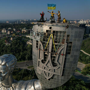 Na visokoj statuti "Majka Ukrajina", jednom od najprepoznatljivijih znamenitosti Ukrajine, juče je umjesto simbola iz sovjetske ere srpa i čekića postavljen državni grb trozubac.