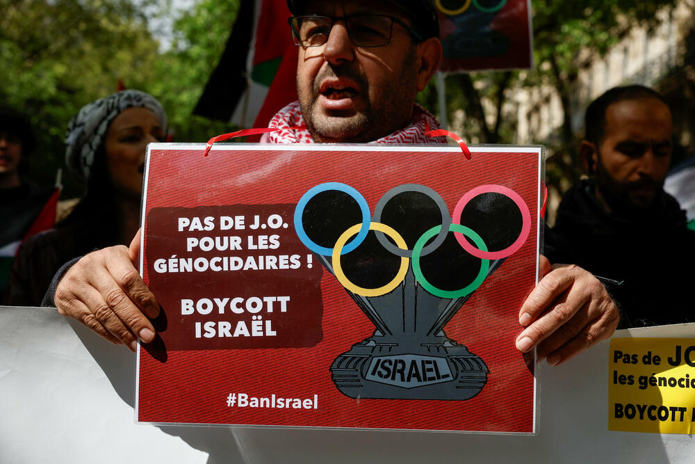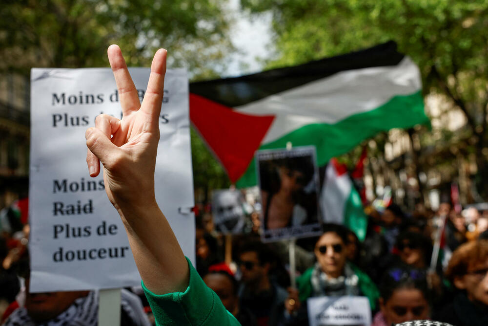 Mnogi demonstranti su nosili palestinske marame u znak solidarnosti sa stanovništvom Pojasa Gaze, a vijorile su se i palestinske zastave.