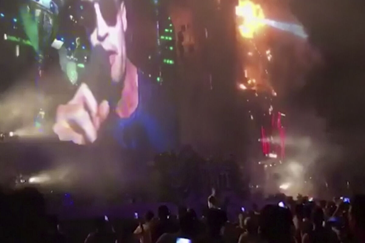 Na video snimcima se vidi kako je plamen najprije zahvatio vrh privremene konstrukcije, a potom se proširio na cijelu binu.